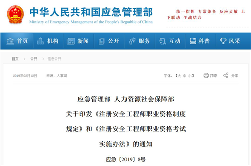 2019年02月12日,中華人民共和國應(yīng)急管理部發(fā)布:應(yīng)急管理部 人力資源社會保障部關(guān)于印發(fā)《注冊安全工程師職業(yè)資格制度規(guī)定》和《注冊安全工程師職業(yè)資格考試實施辦法》的通知。